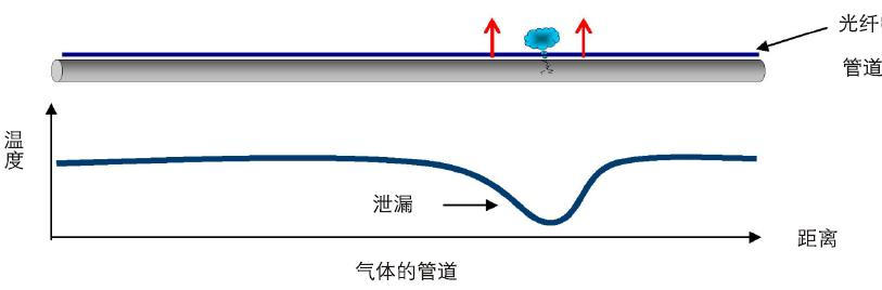 油氣管道泄漏時會引起泄漏點周圍溫度的變化,通過分布式光纖溫度傳感系統(tǒng)可以準確定位泄漏點。在天然氣管線介質(zhì)泄漏受壓情況下,氣態(tài)物質(zhì)導(dǎo)致的泄漏點的低溫,是由物質(zhì)的物理性質(zhì)、工藝條件和周圍環(huán)境所決定的。這些點的溫度異常可通過分布式溫度測量而獲得,并有很好的溫度、距離和反應(yīng)時間精度。管道本身發(fā)生泄漏事故時,泄漏出的天然氣由于存在壓力,會向管道周圍發(fā)出噴射狀的氣體。如果能對整條天然氣管道在現(xiàn)有的壓力、流量探測技術(shù)基礎(chǔ)上,利用沿管道敷設(shè)的通訊光纜,接入分布式光纖測溫傳感主機,就能夠?qū)崟r探測到泄漏點,并進行泄漏點的定位和報警顯示。