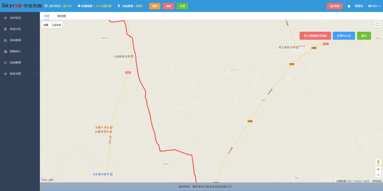 天然氣管線泄漏安全監(jiān)測系統(tǒng)采用目前先進的管道溫度系統(tǒng)監(jiān)測技術(shù)。僅用天然氣管線中的通訊光纜的一根光纖就可實現(xiàn)長達幾十公里的天然氣管道泄漏定位報警。通過基于通訊光纜的分布式光纖測溫技術(shù),對天然氣管線進行在線溫度分布監(jiān)測,就能夠通過管道溫度異常點的探測,準確發(fā)現(xiàn)管道的泄漏點,并及時的進行報警和定位。如果天然氣管線發(fā)生泄漏,高壓氣體的體積膨脹將引起漏點附近溫度的下降,分布式光纖測溫系統(tǒng)同樣可通過溫度異常點的探測,發(fā)現(xiàn)并定位天然氣管線的泄漏點。通過對天然氣管線進行在線的分布式溫度監(jiān)測,并將系統(tǒng)設(shè)備接入管道監(jiān)測系統(tǒng)局域網(wǎng),通過網(wǎng)絡(luò)信號可將溫度信息上傳給中央服務(wù)器??稍谡麄€天然氣管線線路發(fā)生管道泄漏以及事故初期階段,第一時間發(fā)現(xiàn)并報告預(yù)警點的具體位置、溫度變化、溫度下降走向等信息數(shù)據(jù),為天然氣管線管理部門及其它相關(guān)部門及時定位、分析可能發(fā)生的管道泄漏事故提供可靠堅實的信息獲取手段,為天然氣管線系統(tǒng)安全運行提供高效的安全保障。本系統(tǒng)具有本質(zhì)防爆、抗強電磁干擾、電絕緣性好、防雷擊、高精度、重量輕、體積小等優(yōu)點,適合在易燃、易爆等高危環(huán)境應(yīng)用。設(shè)備聯(lián)網(wǎng)后,通過載入百度地圖顯示光纜所在位置地圖,并設(shè)定中心點,選定當(dāng)?shù)厮谖恢?,可根?jù)管道的走向在地圖上標出光纜走向圖,當(dāng)發(fā)生報警時,界面會出現(xiàn)一個彈窗,顯示報警地點,報警時間等。
