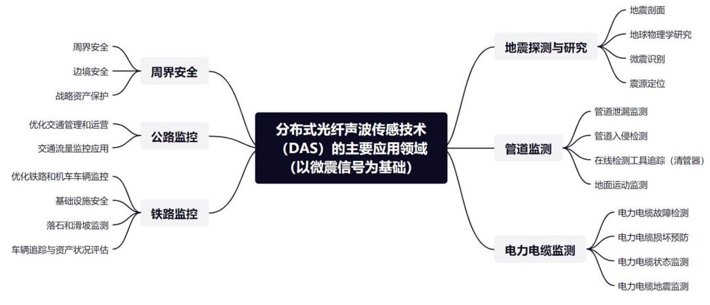 基于光纖的分布式聲波傳感器(DAS)是一種利用光纖中的后向瑞利散射(RBS)來定位和恢復光纖鏈路上的任意位置處機械振動信息(振幅、相位和頻率)的技術 。由于機械振動通常能夠在介質中傳播很遠,DAS 能夠檢測遠離光纖的事件;基于光纖的低損耗特性,傳感光纖的長度可達數千米至上百千米,因此 DAS 系統的探測覆蓋范圍非常廣;DAS 的振動檢測帶寬可高達數十千赫茲,可以包含待測事件的豐富信息 ;傳感光纜具有本征安全、抗電磁干擾、耐惡劣環境等優勢。這些優點使得 DAS 在周界圍欄安防、管道安全監測、井下資源勘探等長距離應用領域中有著巨大的應用潛力,并且其應用領域仍在不斷拓展中。